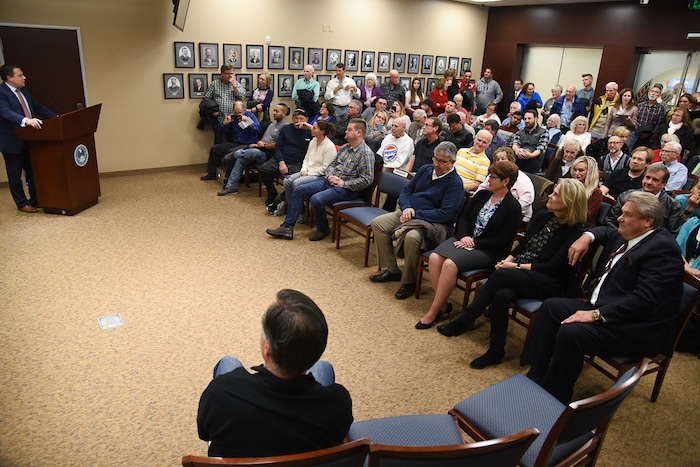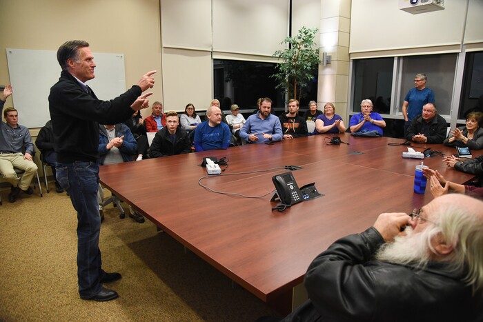 (Francisco Kjolseth | The Salt Lake Tribune) U.S. Senator Mitt Romney holds a town hall meeting at the Davis County administration building, Tuesday, January 22, 2019, to hear from local residents.