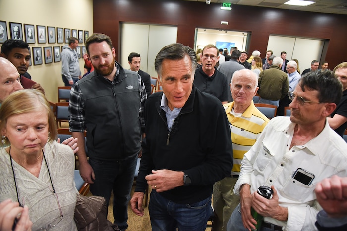 (Francisco Kjolseth | The Salt Lake Tribune) U.S. Senator Mitt Romney, foreground, is introduced arrives for his town hall meeting at the Davis County administration building, Tuesday, January 22, 2019, to hear from local residents.