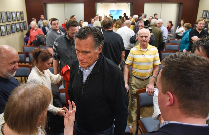 (Francisco Kjolseth | The Salt Lake Tribune) U.S. Senator Mitt Romney visits some of the overflow rooms where people expressed their anger over the federal shutdown after holding a town hall meeting at the Davis County administration building, Tuesday, January 22, 2019, to hear from local residents.