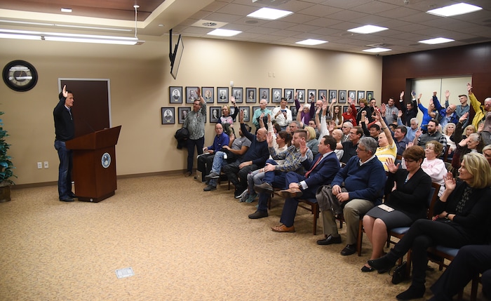 (Francisco Kjolseth | The Salt Lake Tribune) U.S. Senator Mitt Romney asks multiple questions including "who is upset the government is shut down" as he holds a town hall meeting at the Davis County administration building, Tuesday, January 22, 2019, to hear from local residents.