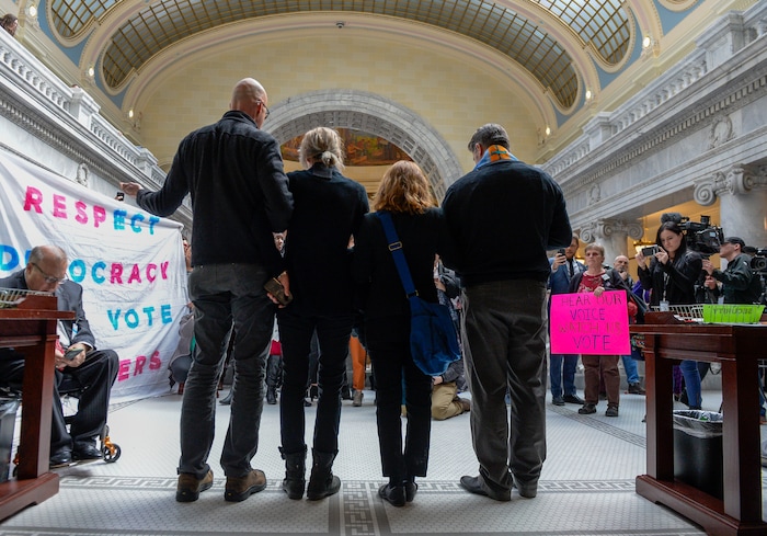 Despite that warning, three demonstrators were later removed from the gallery by Utah Highway Patrol troopers after draping a painted sheet down into the chamber and shouting, “Respect our vote.” Those demonstrators were not arrested, and they relocated to the lobby outside the House chambers, where faith leaders had gathered to kneel in prayer, read scripture and sing patriotic songs while representatives debated SB96.