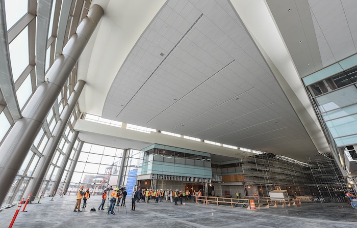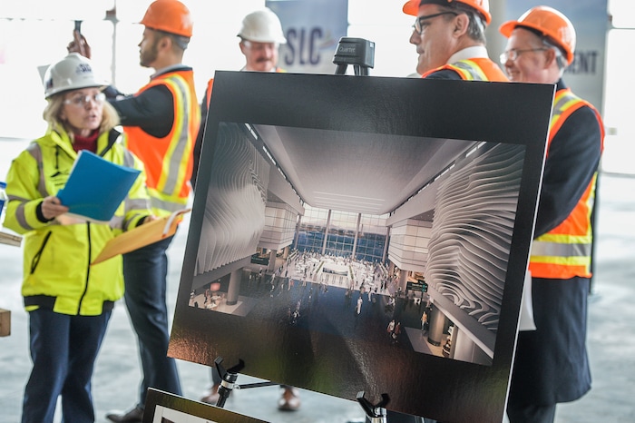 (Francisco Kjolseth | The Salt Lake Tribune) The Terminal Plaza towers above those gathered as Salt Lake City International Airport announces food concessionaires for the first phase of the new expanded airport during a tour on Wed. Feb. 20, 2019.
