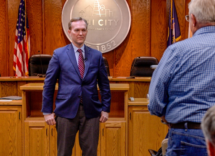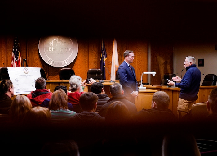 He answered directly and with a smile to an orderly crowd of about 70 at the Lehi City Hall. The event comes after he campaigned by attacking former Rep. Mia Love for dodging such town halls amid fears of violence at them — and vowed to hold them regularly.