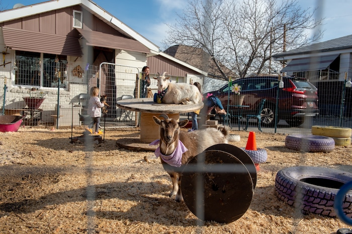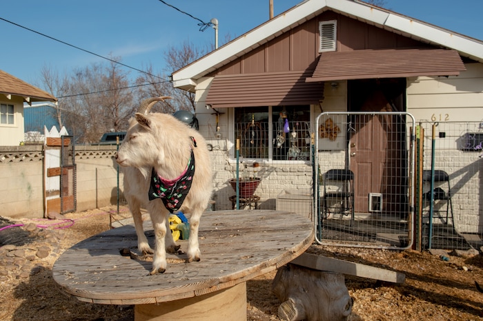 (Rachel Molenda | The Salt Lake Tribune) Pygmy goats Frankie, front, and Marshmallow, back, hang out in Candace Yocum's yard in Midvale, Utah, on Monday, March 11, 2019. Yocum worked with Midvale City Council to allow pygmy goats to be kept as pets.