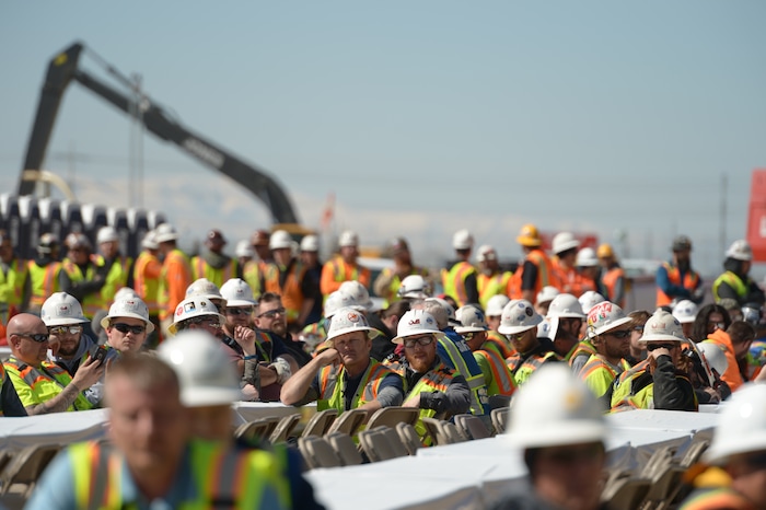 Construction workers listened to remarks by Salt Lake City Council Chairman Charlie Luke; Patrick Leary, chief of staff to Mayor Jackie Biskupski; Department of Airports Executive Director Bill Wyatt and Brett Okland, president of Okland Construction.