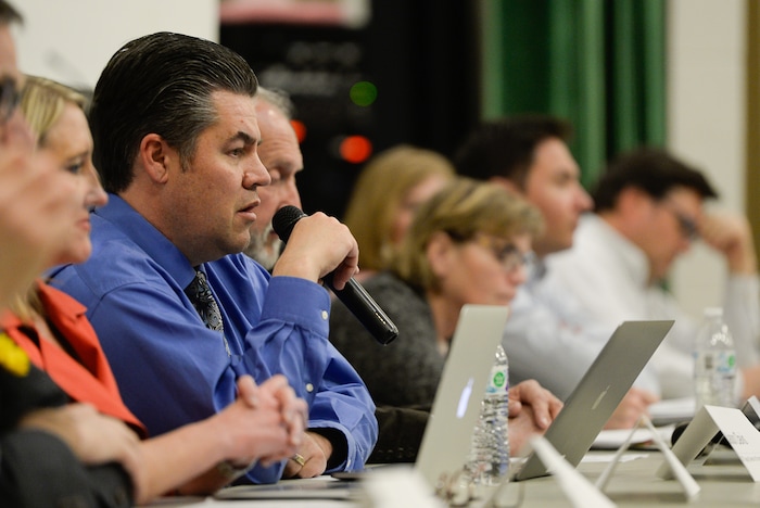 (Francisco Kjolseth | The Salt Lake Tribune) Jason Davis, UDOT Deputy Director of Engineering and Operations reveals the findings of a study that expects a nearly 50 percent increase in traffic when the speed limit is raised on Legacy Parkway. Citizens gathered at Foxboro Elementary School in North Salt Lake on Wed. March 20, 2019, to discuss the neighborhood's future now that adjacent Legacy Parkway will allow big-rig trucks and have a higher speed limit beginning Jan. 1. The Legislature rejected bills to extend the truck ban.