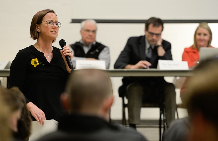 (Francisco Kjolseth | The Salt Lake Tribune) Citizens post their questions and ideas on the wall as they meet at Foxboro Elementary School in North Salt Lake on Wed. March 20, 2019, to discuss the neighborhood's future now that adjacent Legacy Parkway will allow big-rig trucks and have a higher speed limit beginning Jan. 1. The Legislature rejected bills to extend the truck ban.