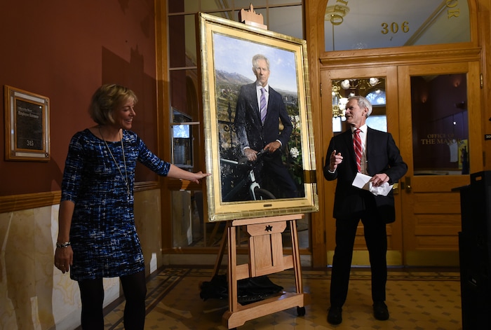 (Francisco Kjolseth | The Salt Lake Tribune) The official portrait of former Salt Lake City Mayor Ralph Becker is unveiled as he is joined by his wife Kate Kopischke on Wed., March 27, 2019, outside the MayorÕs Office at the Salt Lake City-County Building. Becker who served as mayor from 2008 to early 2016, had his portrait done by artist Jeff Hein who took into consideration Becker's championing of the environment and an avid bicycle commuter.