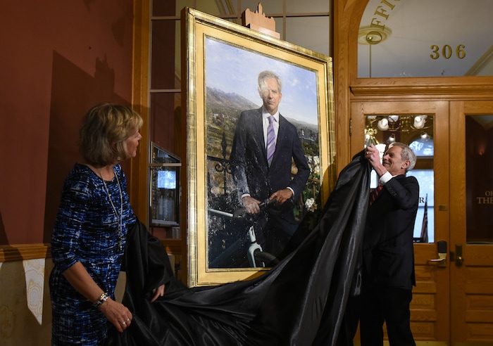 (Francisco Kjolseth | The Salt Lake Tribune) The official portrait of former Salt Lake City Mayor Ralph Becker is unveiled on Wed., March 27, 2019, outside the Mayor’s Office at the Salt Lake City-County Building. Becker who served as mayor from 2008 to early 2016, had his portrait done by artist Jeff Hein who took into consideration Becker's championing of the environment and an avid bicycle commuter.