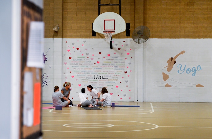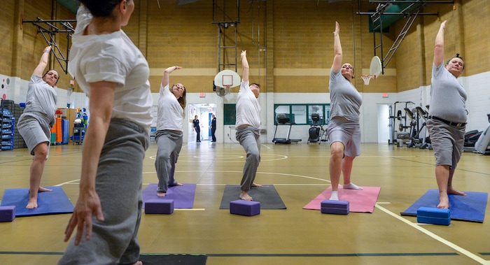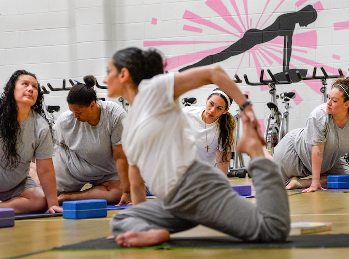 Bluff calmly instructed the women to breathe and find their balance as she led the yoga class on a recent Friday. In unison, they followed, pushing and contorting their bodies from position to position.