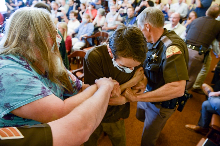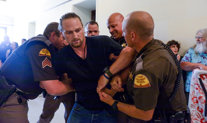 (Leah Hogsten | The Salt Lake Tribune) Ethan PetersenÊwithÊCivil Riot, a SLC-basedÊcivilÊresistance collective, and other opponents of the proposed inland port are escorted out of the Utah Inland Port Authority Board meeting by Utah Highway Patrol officers at the Capitol, June 5, 2019. The Inland Port Authority Board had to cancel its meeting last month after a group of protesters took over the meeting. Petersen was arrested.
