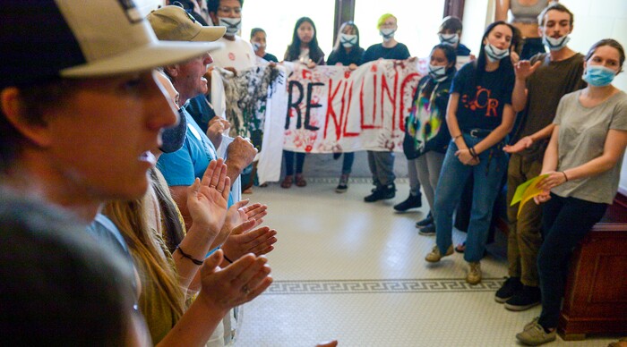 “We’re going to rise up like water,” the protesters sang outside, hitting their hands against the doors in time with the beat. “We’re going to shut this crisis down!”