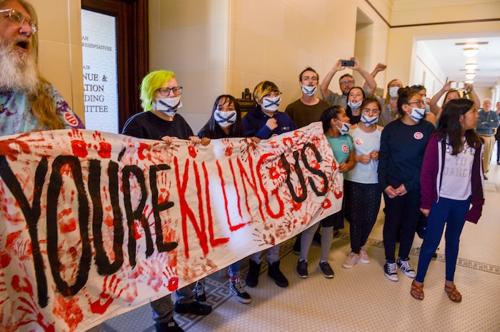 (Leah Hogsten | The Salt Lake Tribune) Opponents of the proposed inland port yell ÒAbort the PortÓ during the Utah Inland Port Authority Board meeting at the Capitol, June 5, 2019. The Inland Port Authority Board had to cancel its meeting last month after a group of protesters took over the meeting.