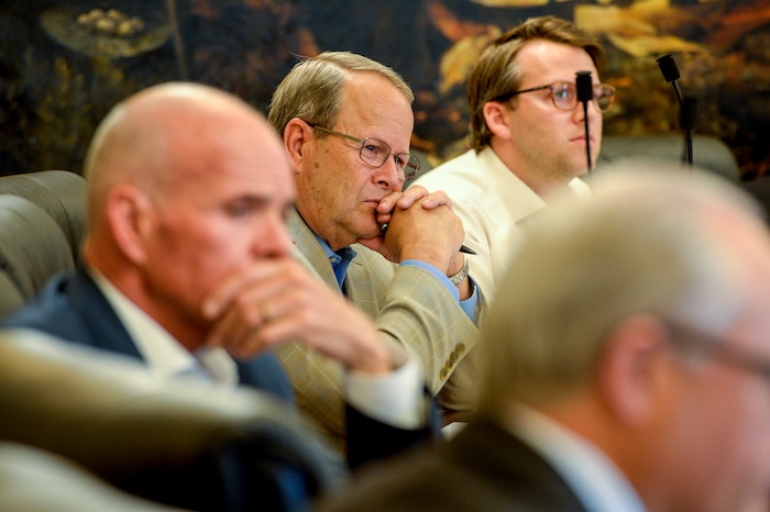 (Leah Hogsten | The Salt Lake Tribune) Board members listen as opponents and proponents voice their opinions during the Utah Inland Port Authority Board meeting at the Capitol, June 5, 2019. The Inland Port Authority Board had to cancel its meeting last month after a group of protesters took over the meeting.