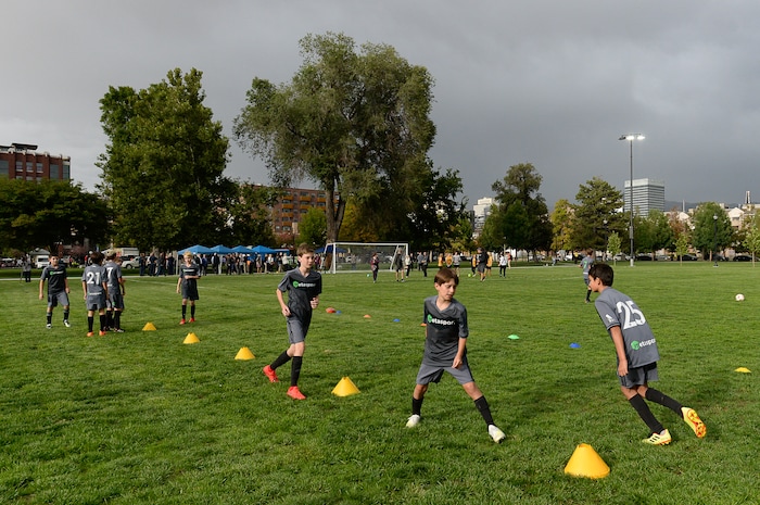 (Francisco Kjolseth | The Salt Lake Tribune) Metasport FC youth soccer league warm up prior to a friendly game with the Blue Knights as part of a jubilee in celebration of the recently completed improvements at Pioneer Park, including a multi-purpose field on Tuesday, September 10, 2019.