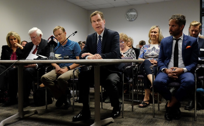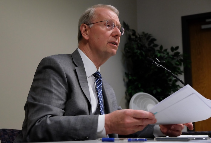 People look on during a hearing Thursday, Sept. 26, 2019, in Salt Lake City. LGBTQ people who say they suffered shame and suicidal thoughts after undergoing gay conversion therapy urged Utah state officials to approve a proposed rule that would prohibit Utah psychologists from the practice that is already banned in 18 states. Opponents who spoke during the hearing countered that the rule should be tabled because they contend it will prevent parents from getting their children help with "unwanted" homosexual feelings. (AP Photo/Rick Bowmer)