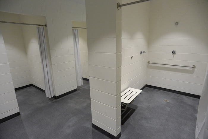(Francisco Kjolseth | The Salt Lake Tribune) Shelter the Homeless and Catholic Community Services of Utah (CCS) holds a public open house at the Gail Miller Resource Center on Friday, Sept. 6, 2019, with self-guided tours for the public to see the brand new building and learn about the services that will be provided there for both men and women. Pictured is the men's shower area.