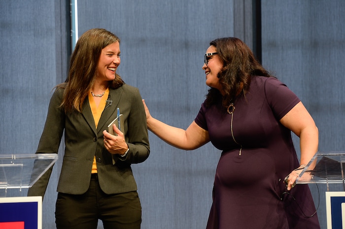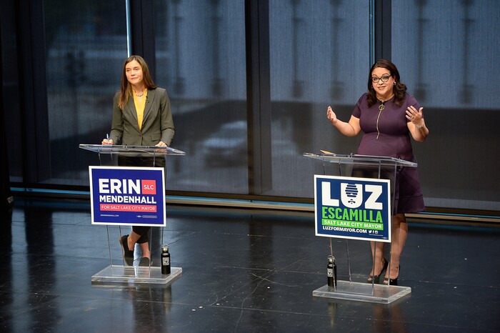 (Francisco Kjolseth | The Salt Lake Tribune) The Downtown Alliance hosts a Salt Lake City mayoral debate between Luz Escamilla, left, and Erin Mendenhall at the Regent Street Black Box at Eccles Theater on Wednesday, October 9, 2019.