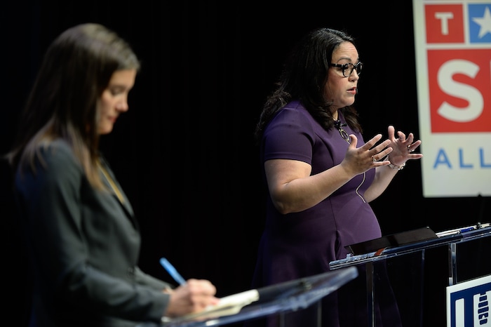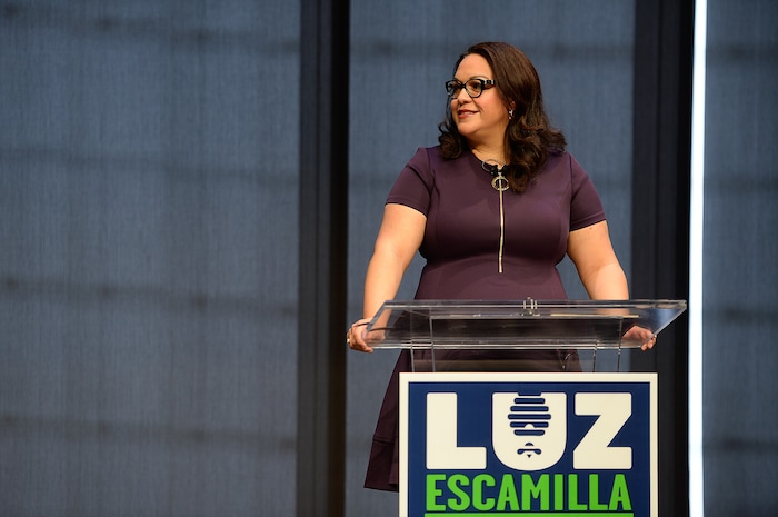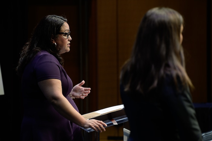 (Francisco Kjolseth | The Salt Lake Tribune) The Downtown Alliance hosts a Salt Lake City mayoral debate between Luz Escamilla, pictured, and Erin Mendenhall at the Regent Street Black Box at Eccles Theater on Wednesday, October 9, 2019.