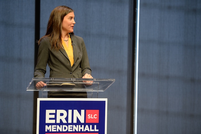 (Francisco Kjolseth | The Salt Lake Tribune) The Downtown Alliance hosts a Salt Lake City mayoral debate between Erin Mendenhall, pictured, and Luz Escamilla at the Regent Street Black Box at Eccles Theater on Wednesday, October 9, 2019.