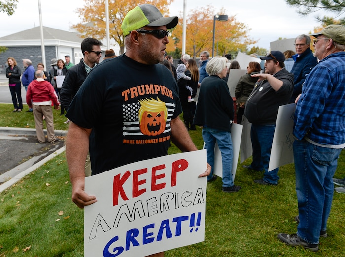 (Francisco Kjolseth | The Salt Lake Tribune) Former Utah House of Representatives speaker Greg Hughes speaks to President Trump supporters as two competing rallies spar near U.S. Rep. Ben McAdams' office in West Jordan, one seeking to support McAdams and one to criticize him for supporting the impeachment inquiry of President Donald Trump on Wednesday, Oct. 9, 2019.