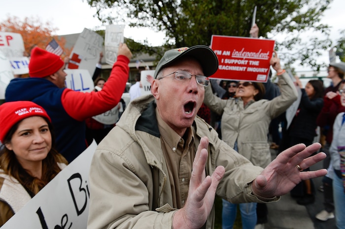 (Francisco Kjolseth | The Salt Lake Tribune) Kevin Howard, foreground, argues with supporters of the impeachment inquiry as two competing rallies spar near Rep. Ben McAdams' office in West Jordan, one seeking to support McAdams and one to criticize him for supporting the impeachment inquiry of President Donald Trump on Wednesday, Oct. 9, 2019.