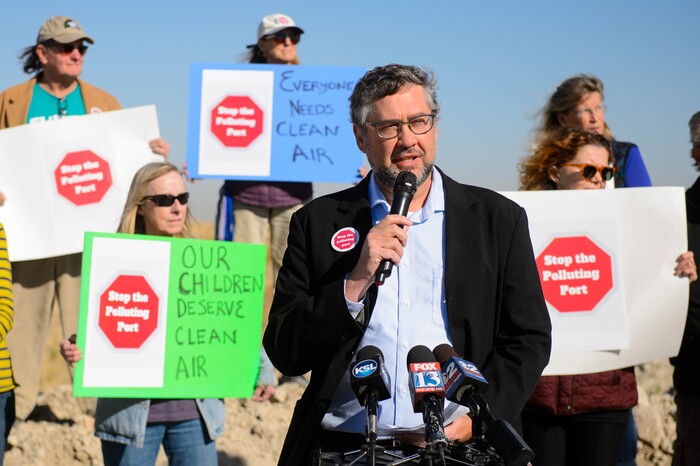 Jonny Vasic, executive director of Utah Physicians for a Healthy Environment, pointed out one possible problem for humans when a long construction truck drove by creating a dust cloud that temporarily engulfed the news conference.