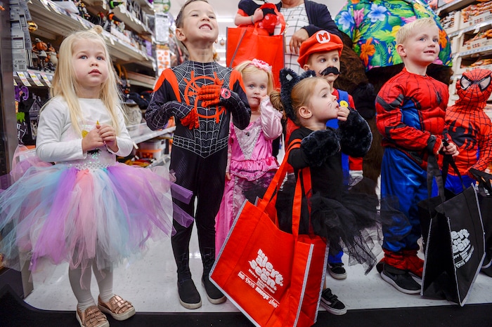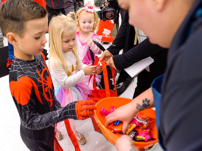 (Leah Hogsten | The Salt Lake Tribune) l-r Hudson Ashcroft, 5, his sister Ella, 3, and a wide-eyed Mattie Robbins, 3, receive a handful of candy on Thursday. Utah first lady Jeanette Herbert handed out reflective totes to children in their Halloween costumes at Macey's grocery store and lead them around the store for trick-or-treating, Oct. 24, 2019, to ramp up child safety awareness this Halloween.