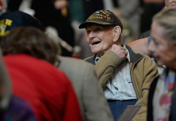 (Francisco Kjolseth | The Salt Lake Tribune) Albert Vise, 100 who was part of the 13th wave on Omaha Beach on D-Day, joins a veteran centenarian celebration honoring over 20 veterans 99 and older in Utah at the State Capitol Rotunda on Tuesday, Nov. 5, 2019.