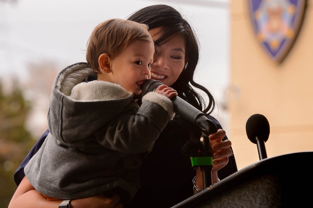 (Trent Nelson | The Salt Lake Tribune) South Salt Lake Police Deputy Chief Dwayne Ruth reaches out to Jackson Romrell at the dedication ceremony of the David P. Romrell Public Safety Building on Sunday Nov. 24, 2019. The building is named after Officer Romrell (Jackson's father), who was killed in the line of duty on Nov. 24, 2018 - one year ago. Holding Jackson is Jennifer Romrell Legerski, Officer Romrell's sister.