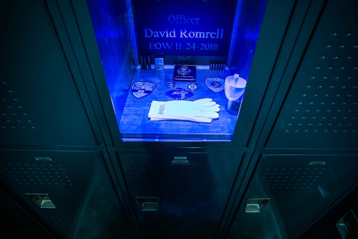 (Trent Nelson | The Salt Lake Tribune) Officer Romrell's locker, memorialized in the David P. Romrell Public Safety Building in South Salt Lake on Sunday Nov. 24, 2019. The building is named after Officer Romrell, who was killed in the line of duty on Nov. 24, 2018 - one year ago.