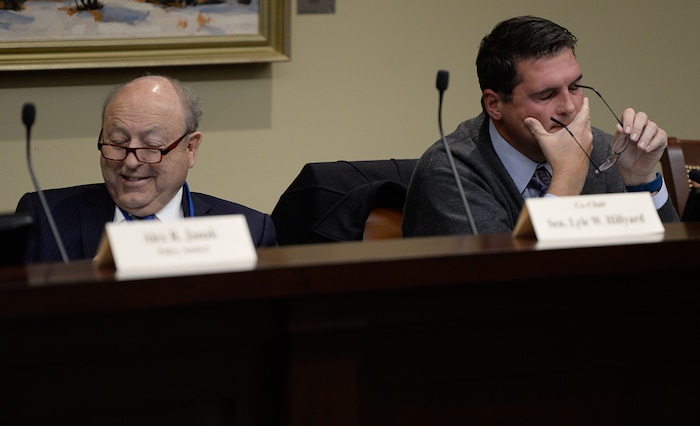 (Francisco Kjolseth | The Salt Lake Tribune) Senator Lyle Hillyard, R-Logan, left, chairman of the tax structuring and equalization task force and Utah Rep. Francis Gibson, R-Mapleton, along with other members of the tax reform task force speak during a meeting at the Utah Capitol on Monday, Nov. 25, 2019.