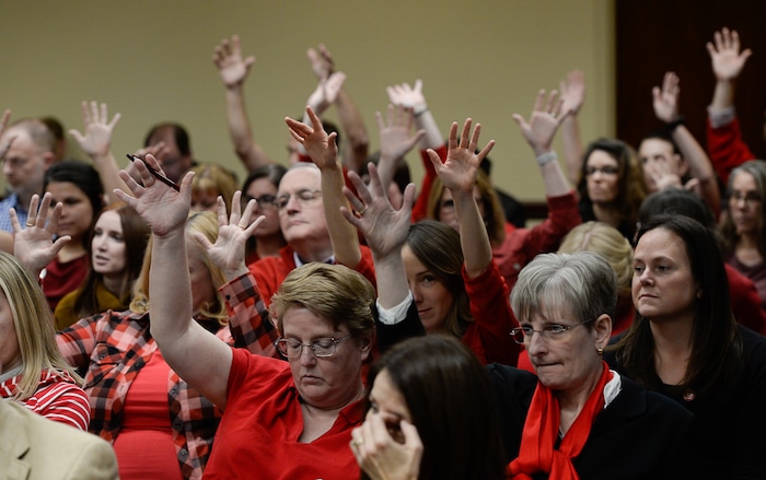 (Francisco Kjolseth | The Salt Lake Tribune) The tax reform task force has a meeting at the Utah Capitol on Monday, Nov. 25, 2019, as teachers turn out in large numbers to oppose any weakening of guarantee for public ed funding.