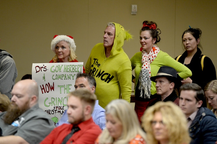 (Francisco Kjolseth | The Salt Lake Tribune) Jonalee Tobias, Greg Zenger and Stephanie Clancy, from left, depict The Grinch as they attend the tax reform task force meeting