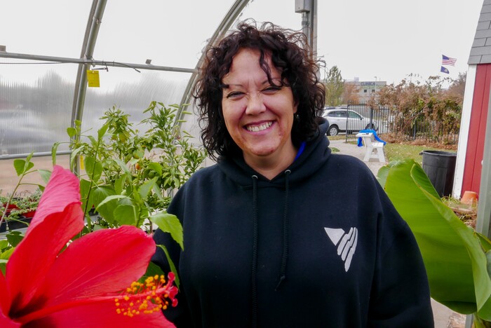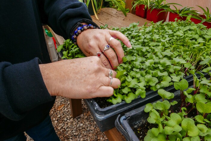 Harris said in the years since she learned to care for herself at the center, largely through her work in its greenhouse, where she has volunteered for the past decade. There, she grows microgreens — which she snacks on voraciously throughout the day — and cares for the hibiscus plants, orange trees and succulents. Now, she shows the center residents how to harvest microgreens and care for the greenhouse plants.