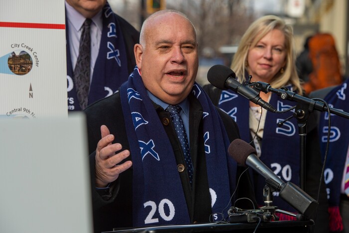 (Rick Egan | The Salt Lake Tribune) Derek Miller, president and CEO of the Salt Lake Chamber and Downtown Alliance, speaks as officials celebrate the 20th anniversary of TRAX trains during a news conference at the City Creek TRAX stop on Main Street in Salt Lake City, Wednesday, Dec. 4, 2019.