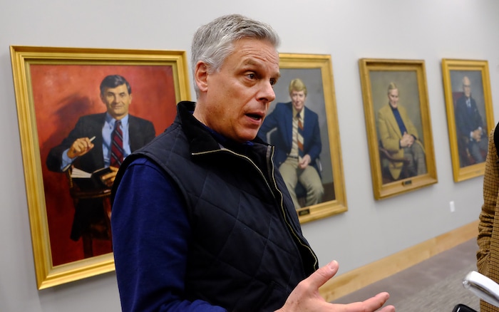 (Francisco Kjolseth | The Salt Lake Tribune) Former Utah Governor and Ambassador Jon Huntsman answers reporters questions following a conversation at the Hinckley Institute of Politics on the University of Utah campus on Thursday, Dec. 5, 2019, to discuss his long career in public service spanning from Utah’s Governor’s Mansion to Chinese and Russian ambassadorships and examine the increasing significance Utah plays in our globalized world.