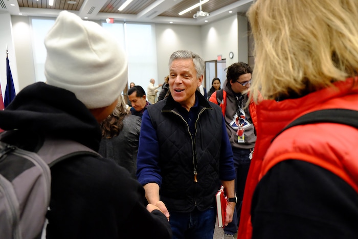(Francisco Kjolseth | The Salt Lake Tribune) Former Utah Governor and Ambassador Jon Huntsman greets students following a conversation at the Hinckley Institute of Politics on the University of Utah campus on Thursday, Dec. 5, 2019, to discuss his long career in public service spanning from Utah’s Governor’s Mansion to Chinese and Russian ambassadorships and examine the increasing significance Utah plays in our globalized world.