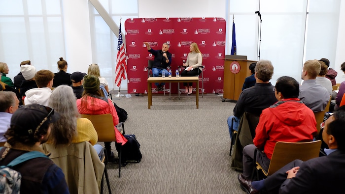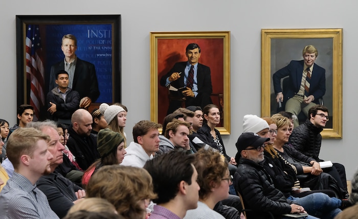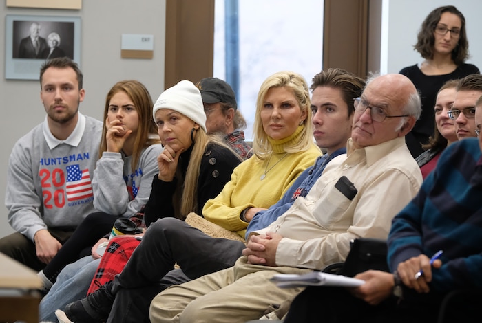 (Francisco Kjolseth | The Salt Lake Tribune) People listen in as former Utah Governor and Ambassador Jon Huntsman speaks at the Hinckley Institute of Politics on the University of Utah campus on Thursday, Dec. 5, 2019, to discuss his long career in public service spanning from Utah's Governor's Mansion to Chinese and Russian ambassadorships and examine the increasing significance Utah plays in our globalized world.