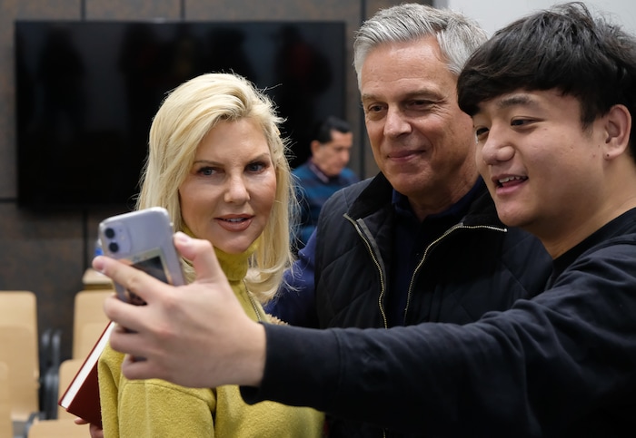(Francisco Kjolseth | The Salt Lake Tribune) Former Utah Governor and Ambassador Jon Huntsman is joined by his wife Mary Kaye as student Brandon Ong snaps a picture following a conversation at the Hinckley Institute of Politics on the University of Utah campus on Thursday, Dec. 5, 2019, to discuss his long career in public service spanning from Utah's Governor's Mansion to Chinese and Russian ambassadorships and examine the increasing significance Utah plays in our globalized world.