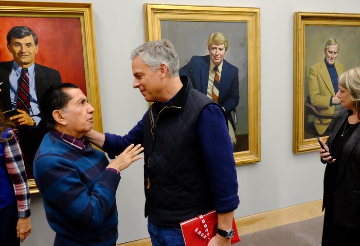 (Francisco Kjolseth | The Salt Lake Tribune) George Riveros speaks with former Utah Governor and Ambassador Jon Huntsman following a discussion at the Hinckley Institute of Politics on the University of Utah campus on Thursday, Dec. 5, 2019, to discuss his long career in public service spanning from Utah's Governor's Mansion to Chinese and Russian ambassadorships and examine the increasing significance Utah plays in our globalized world.