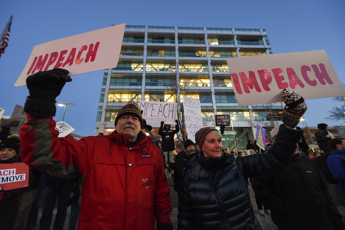 (Francisco Kjolseth | The Salt Lake Tribune) Larry and Anita Sheldon join other activists gathered outside the Wallace F. Bennett Federal Building on Tuesday, Dec. 17, 2019, as part of the nationwide ÒNobody Is Above the LawÓ rallies, the day before the U.S. House of Representatives votes to impeach Donald Trump for high crimes and misdemeanors. The rally in Salt Lake City is one of more than 500 rallies occurring nationwide in all 50 states.