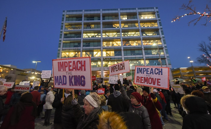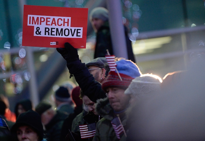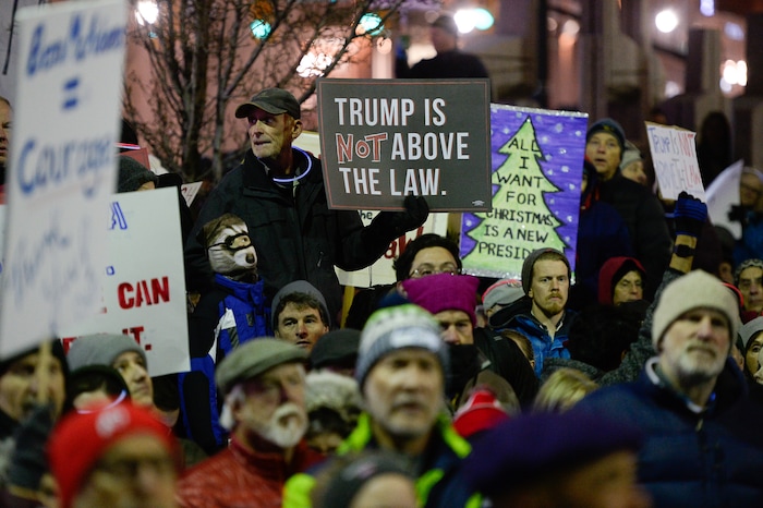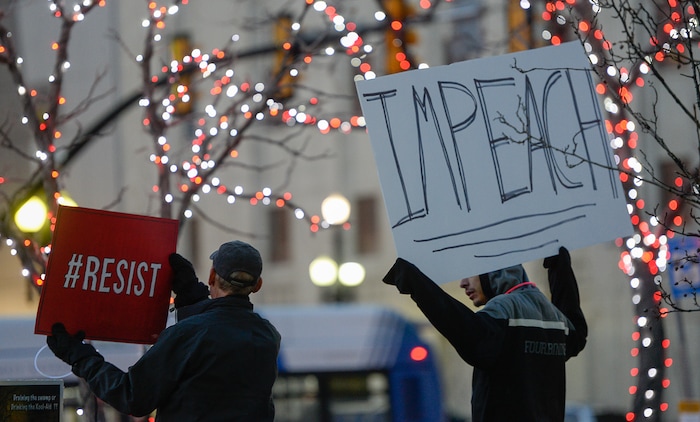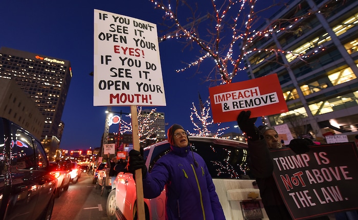 (Francisco Kjolseth | The Salt Lake Tribune) Activists gather outside the Wallace F. Bennett Federal Building on Tuesday, Dec. 17, 2019, as part of the nationwide “Nobody Is Above the Law” rallies, the day before the U.S. House of Representatives votes to impeach Donald Trump for high crimes and misdemeanors. The rally in Salt Lake City is one of more than 500 rallies occurring nationwide in all 50 states.