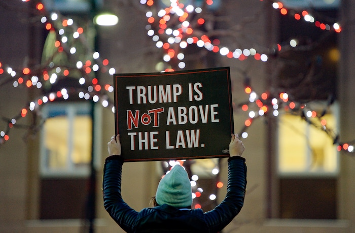 (Francisco Kjolseth | The Salt Lake Tribune) Shelby Halls joins other activists gathered outside the Wallace F. Bennett Federal Building on Tuesday, Dec. 17, 2019, as part of the nationwide ÒNobody Is Above the LawÓ rallies, the day before the U.S. House of Representatives votes to impeach Donald Trump for high crimes and misdemeanors. The rally in Salt Lake City is one of more than 500 rallies occurring nationwide in all 50 states.