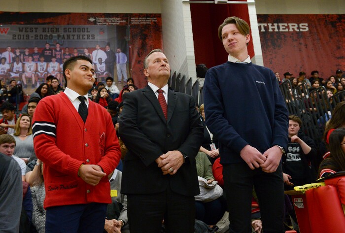 (Leah Hogsten | The Salt Lake Tribune) West High School students, Felix Ortiz, center, and Grant Dunkley, right, smile as they are recognized for saving the life of Assistant Attorney General David Carlson, left, during an assembly at the school, Jan. 17, 2020. On February 19, 2019, Ortiz and Dunkley both pulled over to assist Carlson out of his overturned car on the 600 North bridge in Salt Lake City where Ortiz performed life-saving CPR until first responders arrived on the scene.