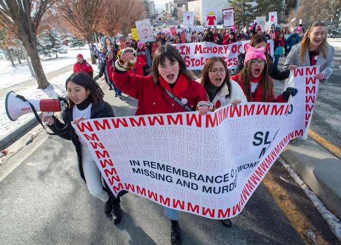 (Rick Egan | The Salt Lake Tribune) Yen Hoang, Camryn Fife and Birdy Francis chant as they lead the marchers up State Street from Washington Square Park to the Capitol Building, in the 2020 Womxn's March in Salt Lake City, Saturday, Jan. 18, 2020.