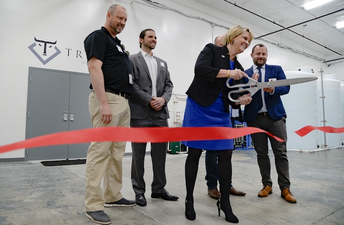 (Francisco Kjolseth | The Salt Lake Tribune) Mayor of Tooele City Debbie Winn cuts the ribbon at Tryke as the company celebrates the grand opening of its cannabis farm in Tooele, on Thursday, Jan. 30, 2020. The company, one of eight cultivators approved by the state, is expected to have product available for patients by March as part of Utah's medical cannabis program.