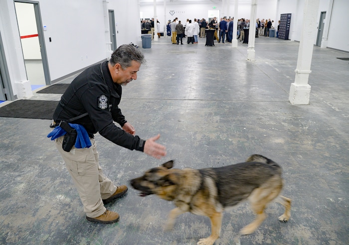 (Francisco Kjolseth | The Salt Lake Tribune) Security team member Walter Simpson works with his dog Nero who specializes in making sure no cannabis is smuggled out by employees at Tryke Companies, a new cannabis farm in Tooele, Utah on Thursday, Jan. 30, 2020.