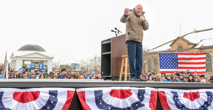 “Our administration will stand up to the corporate elites,” he told those at the Monday rally. “We’re going to stand up to Wall Street. We’re going to stand up to the corruption of the drug companies. We’re going to stand up to the insurance companies. We’re going to stand up to the fossil fuel industry. We’re going to stand up to the military industrial complex. We’re going to stand up to the prison industrial complex.”