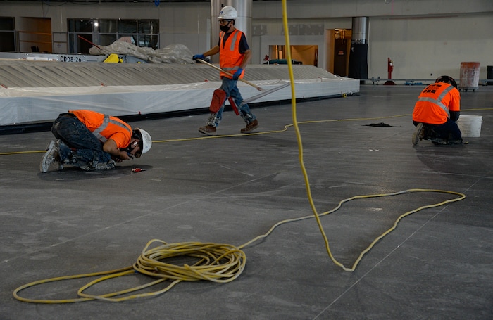 (Francisco Kjolseth | The Salt Lake Tribune) Crews pay close attention to polished terrazzo floors made up chips of marble and other stone products with cement or epoxy, forming a strong, durable flooring surface as crews continue their work in the first phase of construction of the Salt Lake City International Airport on Wednesday, May 20, 2020.